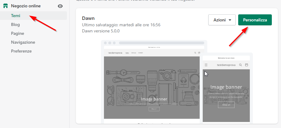Per modificare manualmente il tema, è necessario andare su Negozio Online > Temi e selezionare Personalizza sul tema che si vuole modificare.
